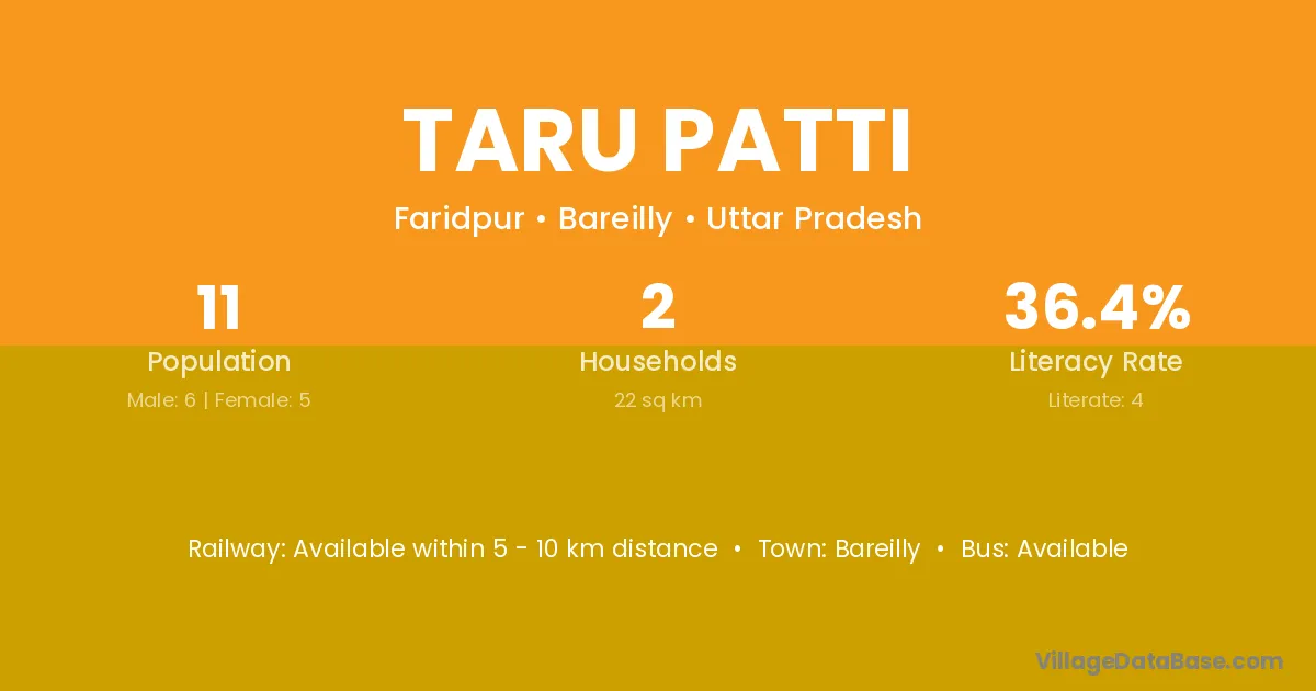 The literacy rate of Taru Patti village is 36.36%. Male literacy stands at 50.00% and female literacy at 20.00%.