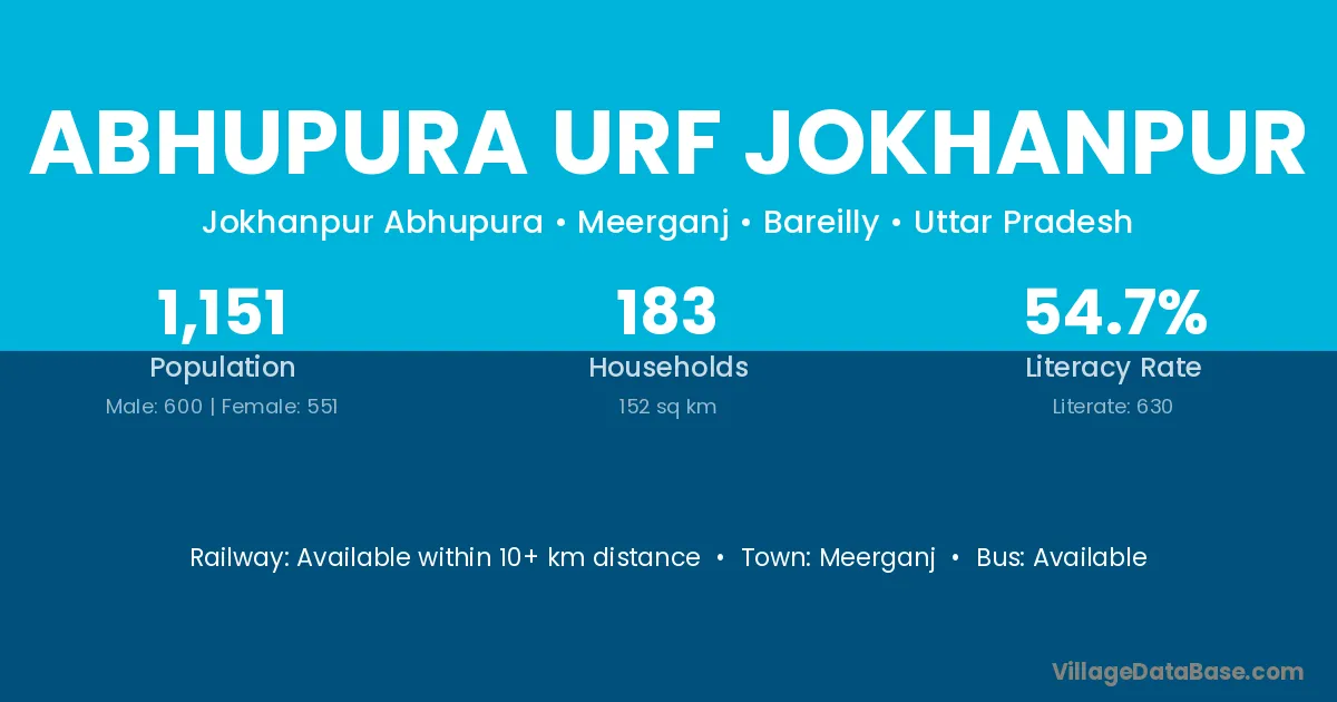 Abhupura Urf Jokhanpur village has a total population of 1,151 people, of which 600 are males and 551 are females.