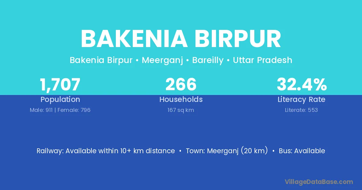Meerganj (20 km) is the nearest town to Bakenia Birpur village for major economic activities and is located approximately 20 km away.