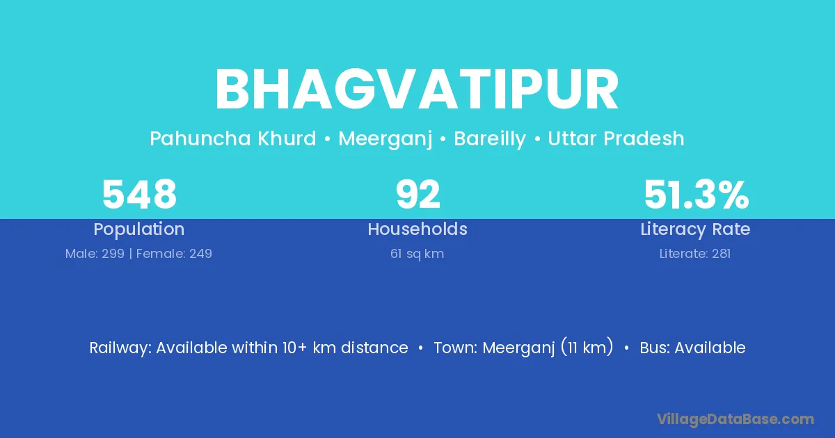 Meerganj (11 km) is the nearest town to Bhagvatipur village for major economic activities and is located approximately 11 km away.