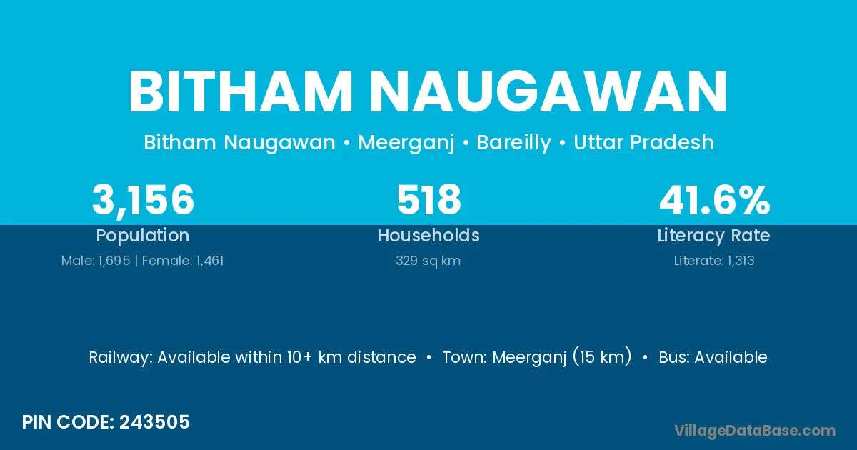 Meerganj (15 km) is the nearest town to Bitham Naugawan village for major economic activities and is located approximately 15 km away.