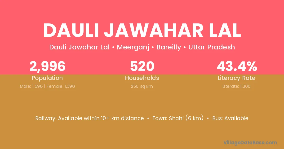 Dauli Jawahar Lal village has a total population of 2,996 people, of which 1,598 are males and 1,398 are females.