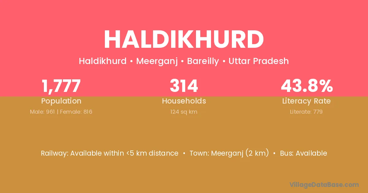 Meerganj (2 km) is the nearest town to Haldikhurd village for major economic activities and is located approximately 2 km away.