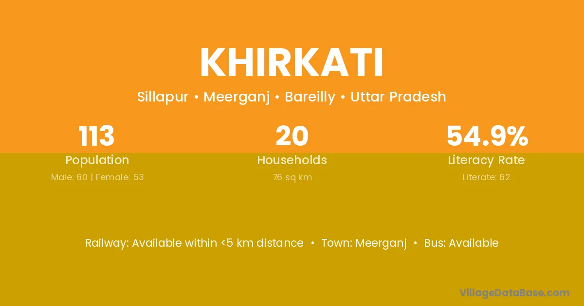 Khirkati village has a total population of 113 people, of which 60 are males and 53 are females.