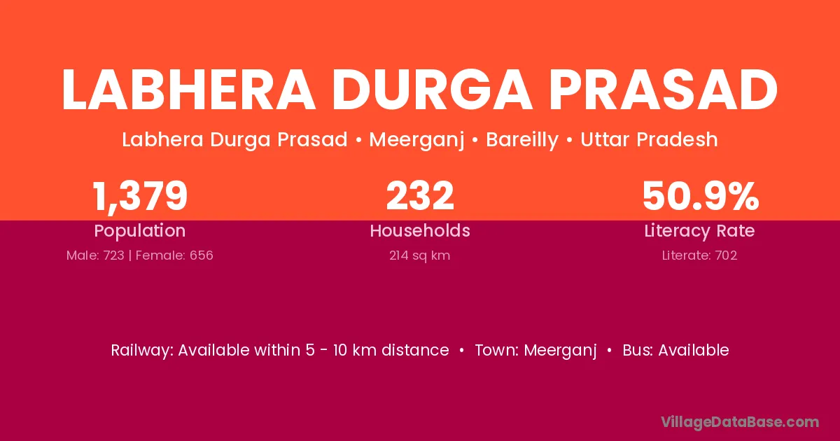 Labhera Durga Prasad village has a total population of 1,379 people, of which 723 are males and 656 are females.