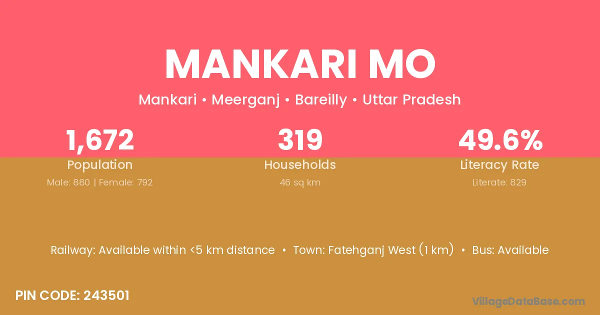 Fatehganj West (1 km) is the nearest town to Mankari Mo village for major economic activities and is located approximately 1 km away.