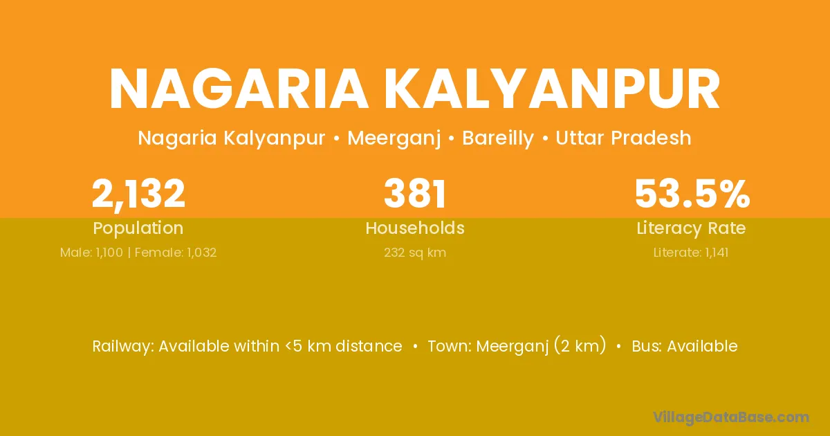 Meerganj (2 km) is the nearest town to Nagaria Kalyanpur village for major economic activities and is located approximately 2 km away.