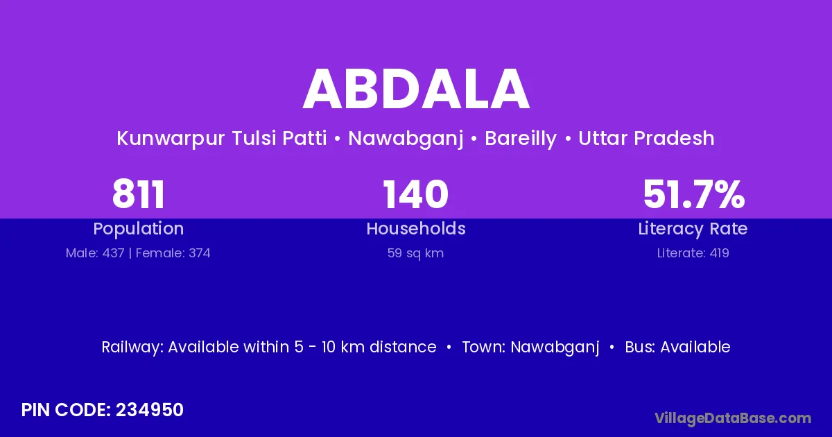 Abdala village is located in the Nawabganj Tehsil of the Bareilly district in Uttar Pradesh .