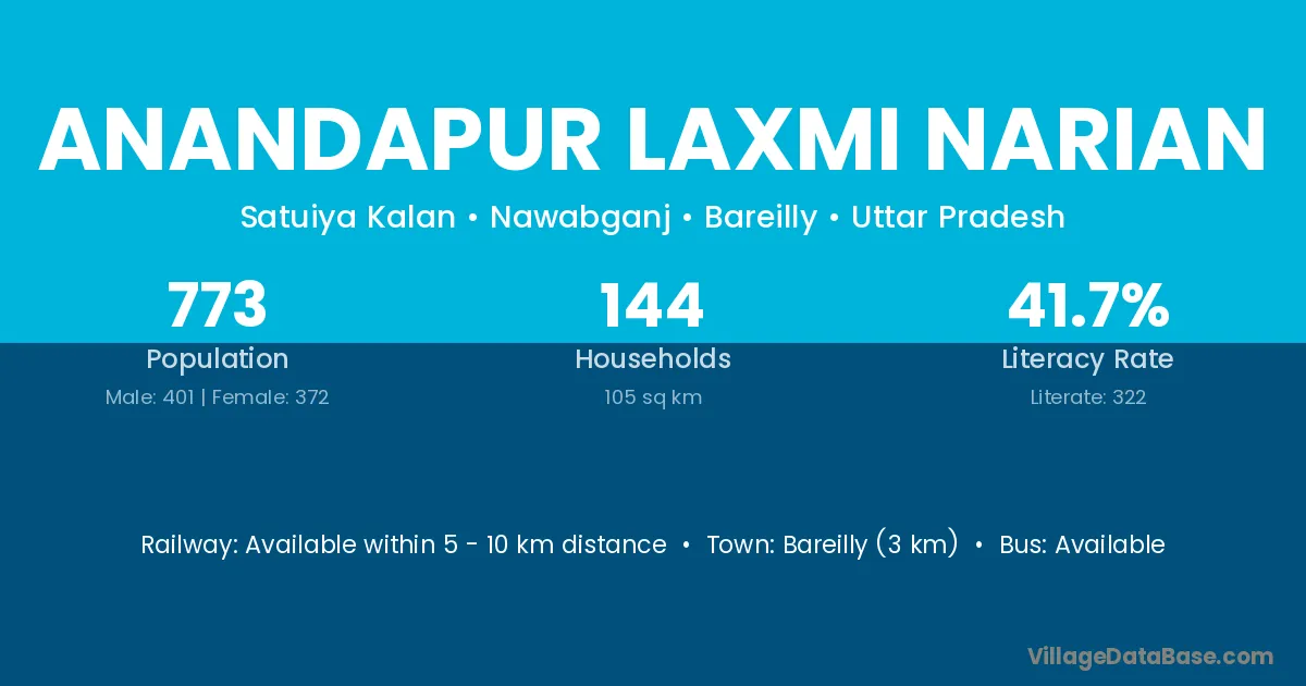 Bareilly (3 km) is the nearest town to Anandapur Laxmi Narian village for major economic activities and is located approximately 3 km away.