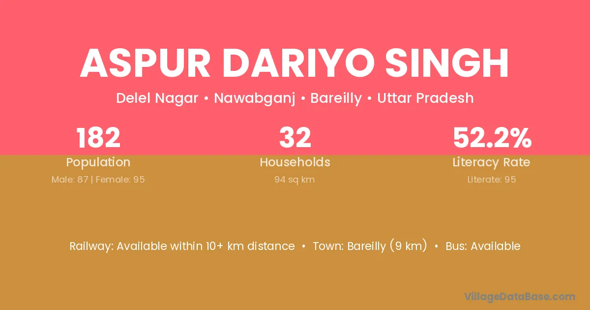 Aspur Dariyo Singh village has a total population of 182 people, of which 87 are males and 95 are females.