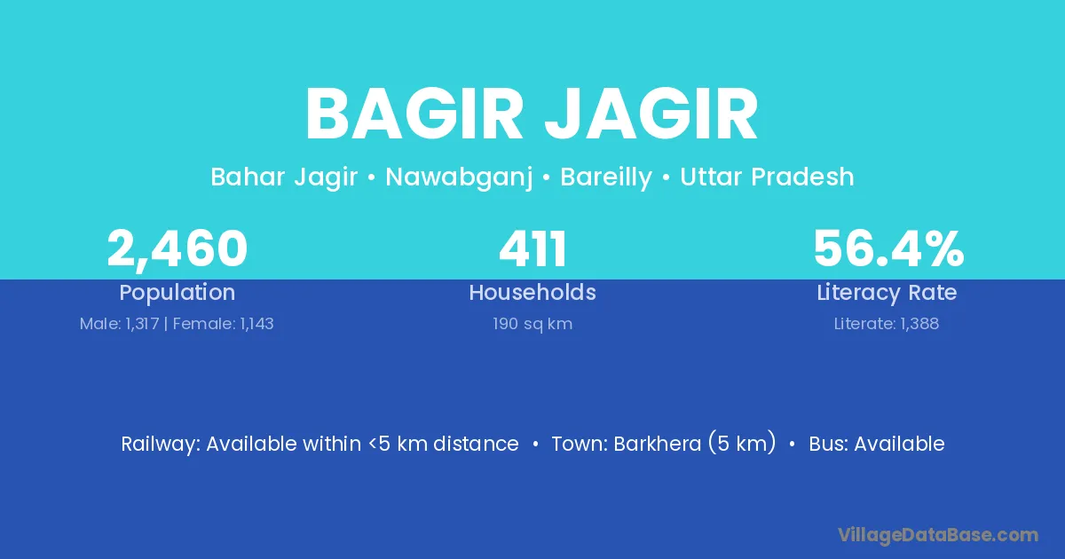Barkhera (5 km) is the nearest town to Bagir Jagir village for major economic activities and is located approximately 5 km away.