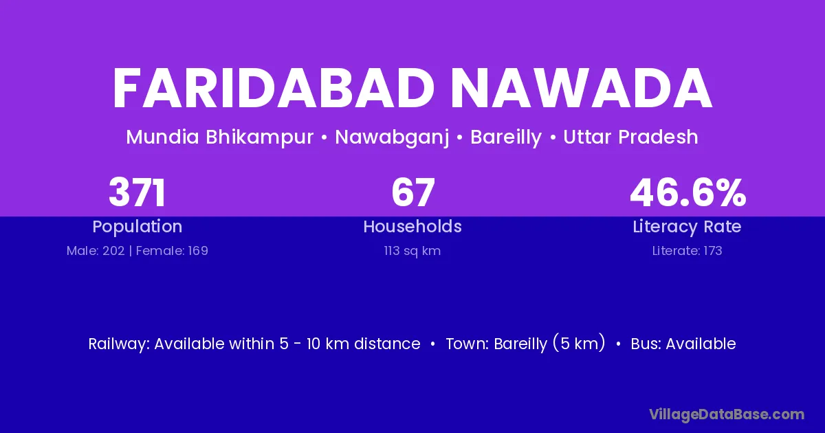 Bareilly (5 km) is the nearest town to Faridabad Nawada village for major economic activities and is located approximately 5 km away.