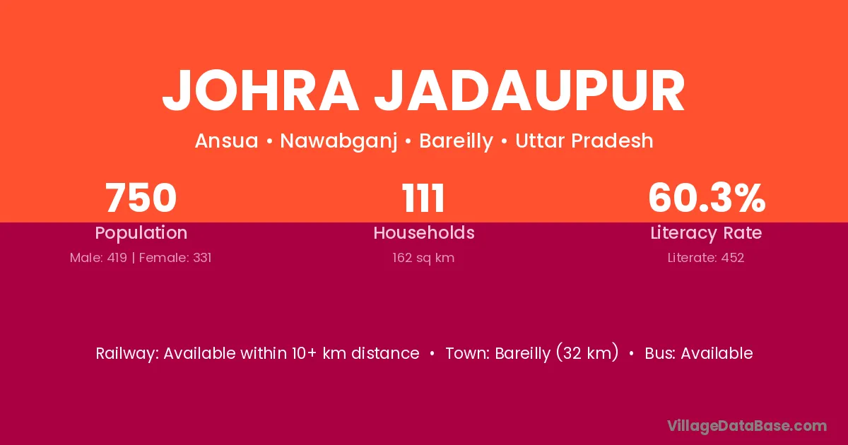 Bareilly (32 km) is the nearest town to Johra Jadaupur village for major economic activities and is located approximately 32 km away.