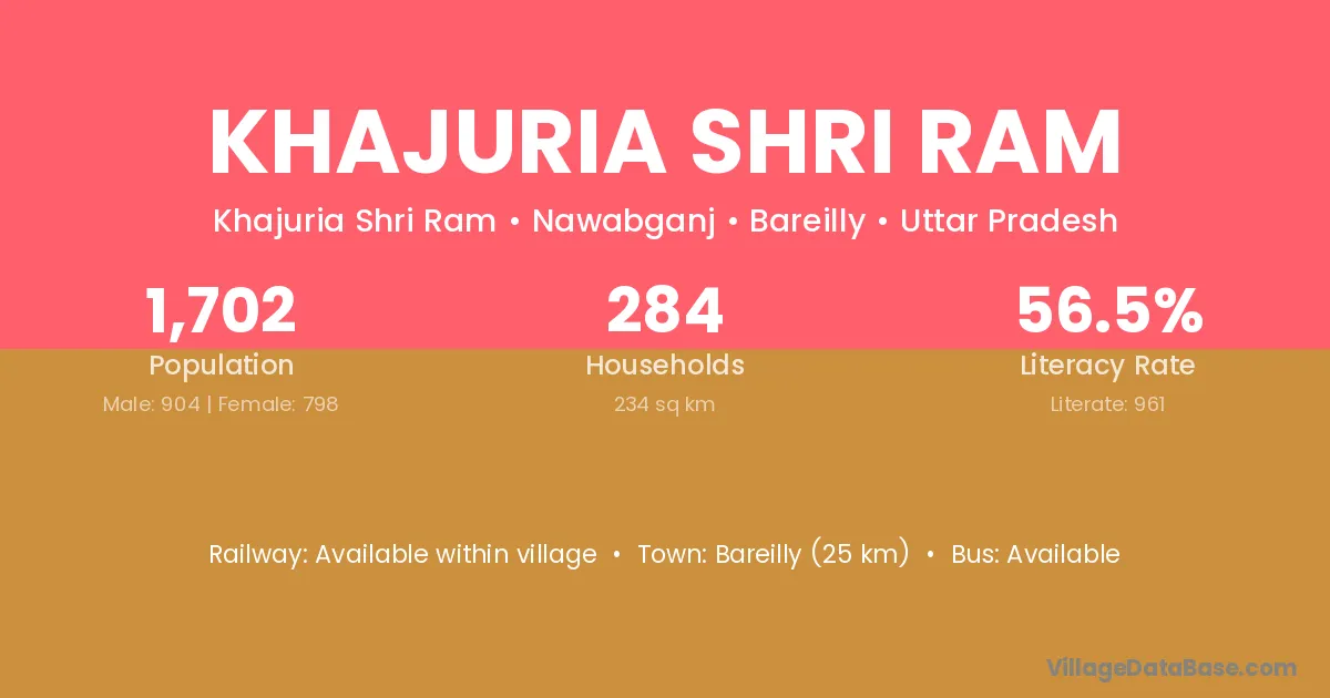Bareilly (25 km) is the nearest town to Khajuria Shri Ram village for major economic activities and is located approximately 25 km away.
