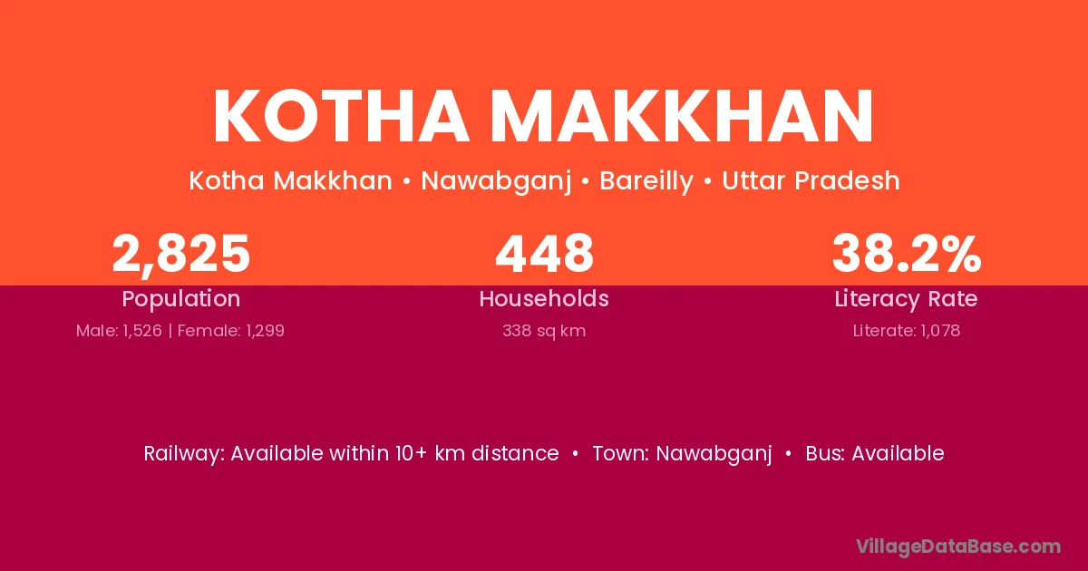 Kotha Makkhan village has a total population of 2,825 people, of which 1,526 are males and 1,299 are females.
