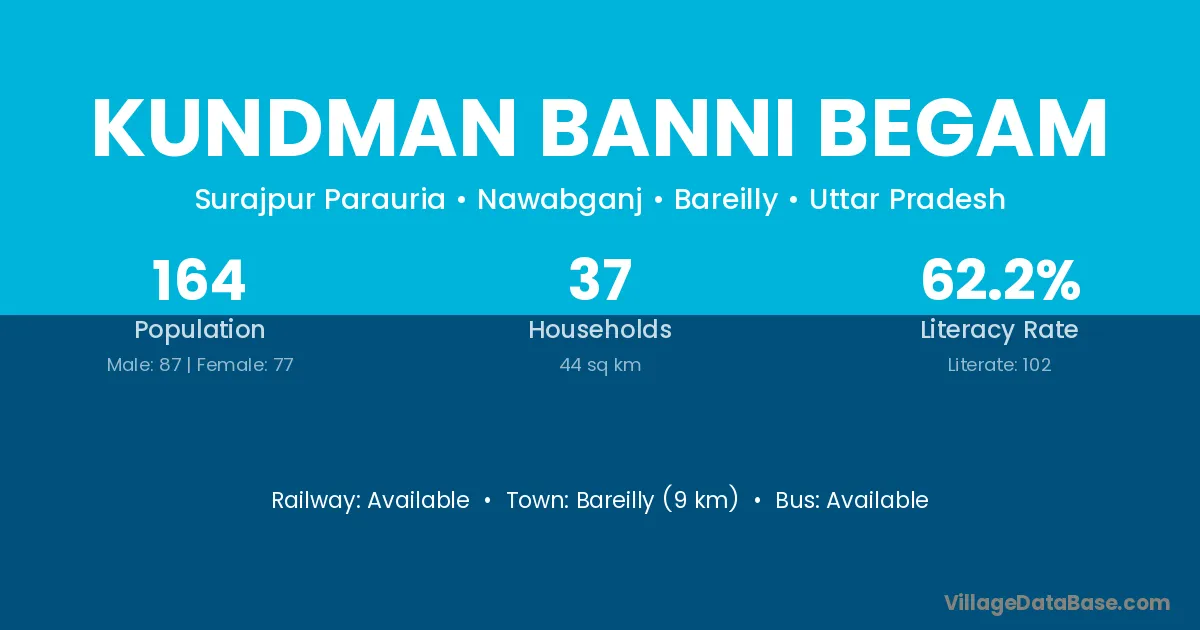 Bareilly (9 km) is the nearest town to Kundman Banni Begam village for major economic activities and is located approximately 9 km away.