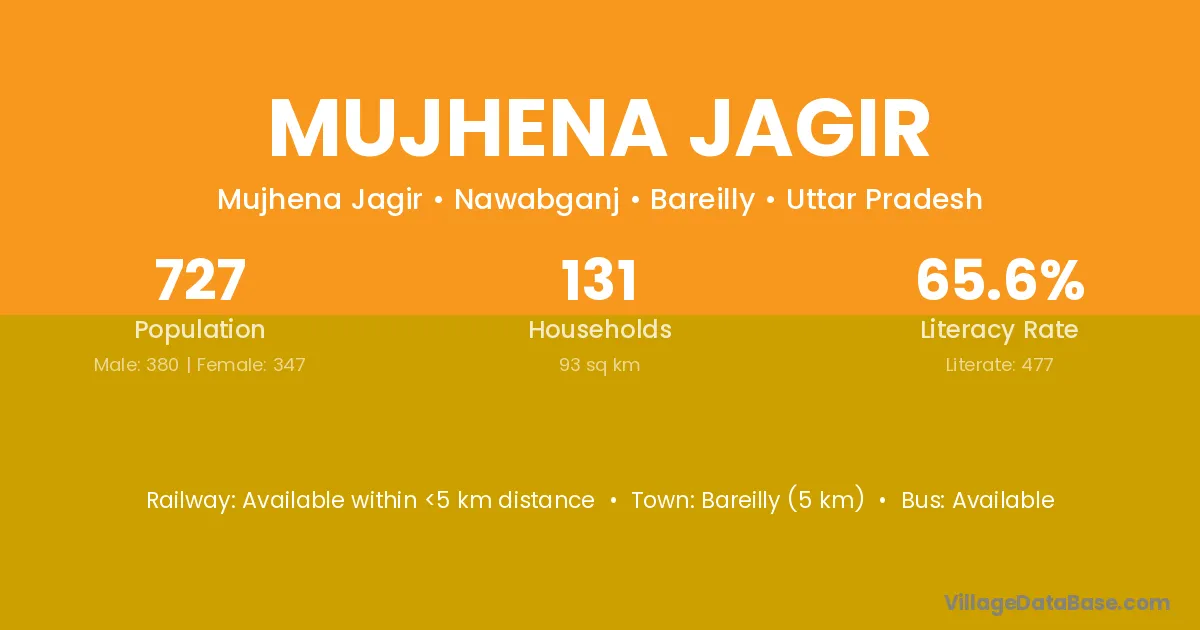 Mujhena Jagir village has a total population of 727 people, of which 380 are males and 347 are females.