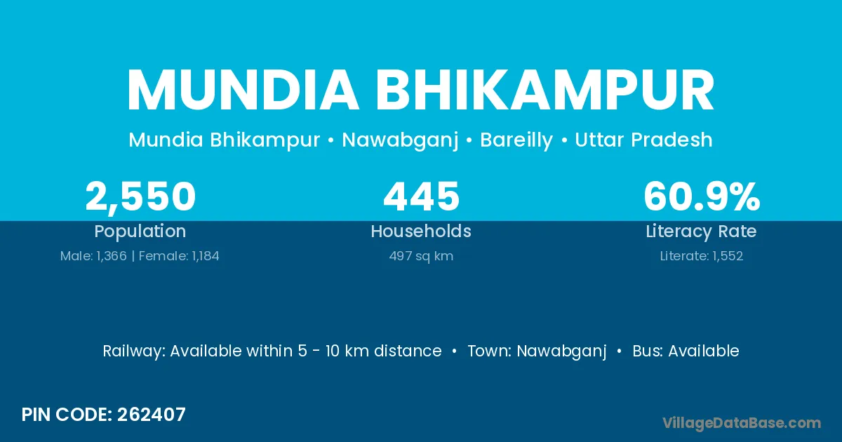 Mundia Bhikampur village has a total population of 2,550 people, of which 1,366 are males and 1,184 are females.