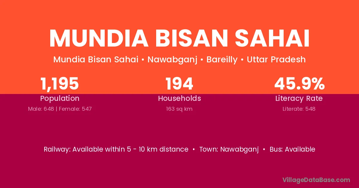 Mundia Bisan Sahai village has a total population of 1,195 people, of which 648 are males and 547 are females.