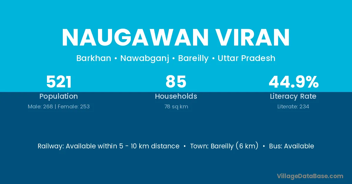 Bareilly (6 km) is the nearest town to Naugawan Viran village for major economic activities and is located approximately 6 km away.