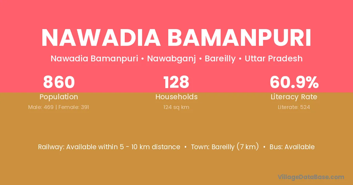 Bareilly (7 km) is the nearest town to Nawadia Bamanpuri village for major economic activities and is located approximately 7 km away.
