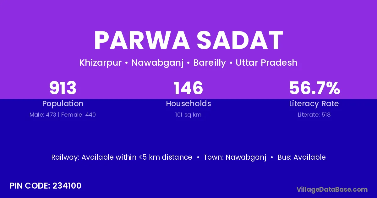Parwa Sadat village has a total population of 913 people, of which 473 are males and 440 are females.