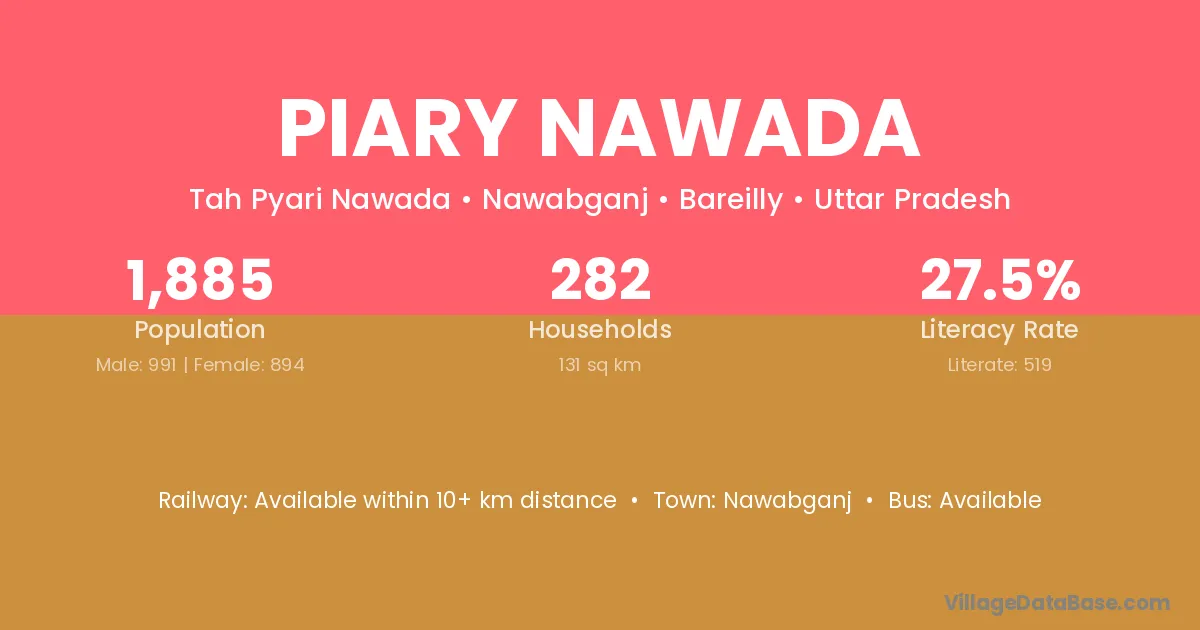 Piary Nawada village has a total population of 1,885 people, of which 991 are males and 894 are females.