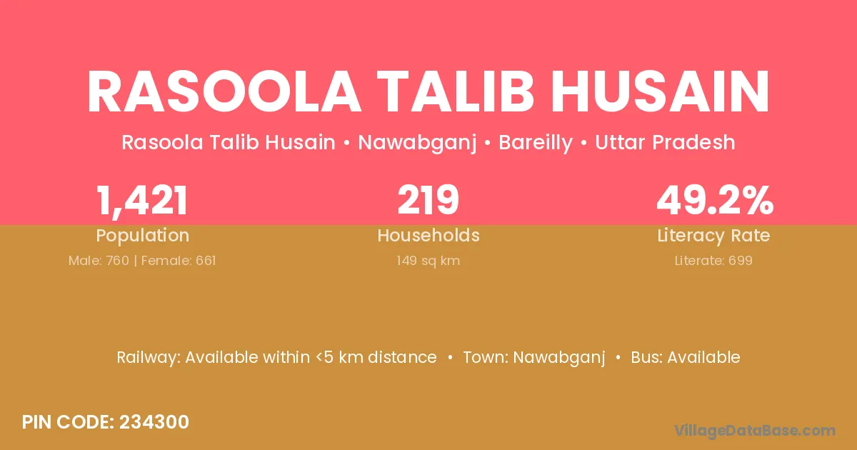 Rasoola Talib Husain village has a total population of 1,421 people, of which 760 are males and 661 are females.