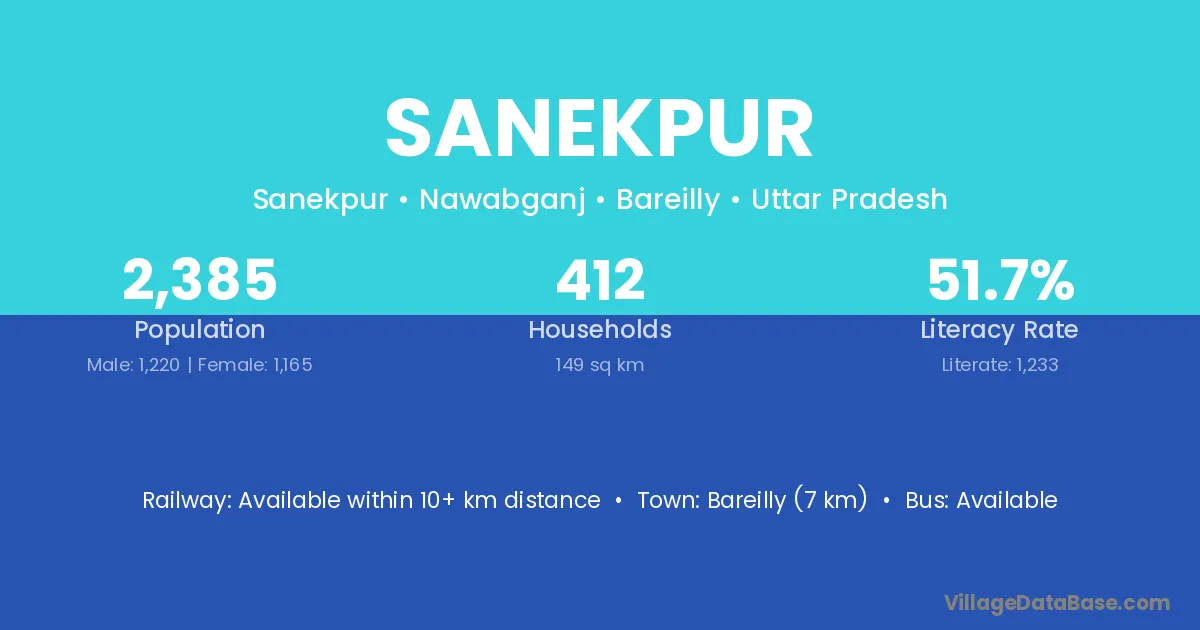 Bareilly (7 km) is the nearest town to Sanekpur village for major economic activities and is located approximately 7 km away.