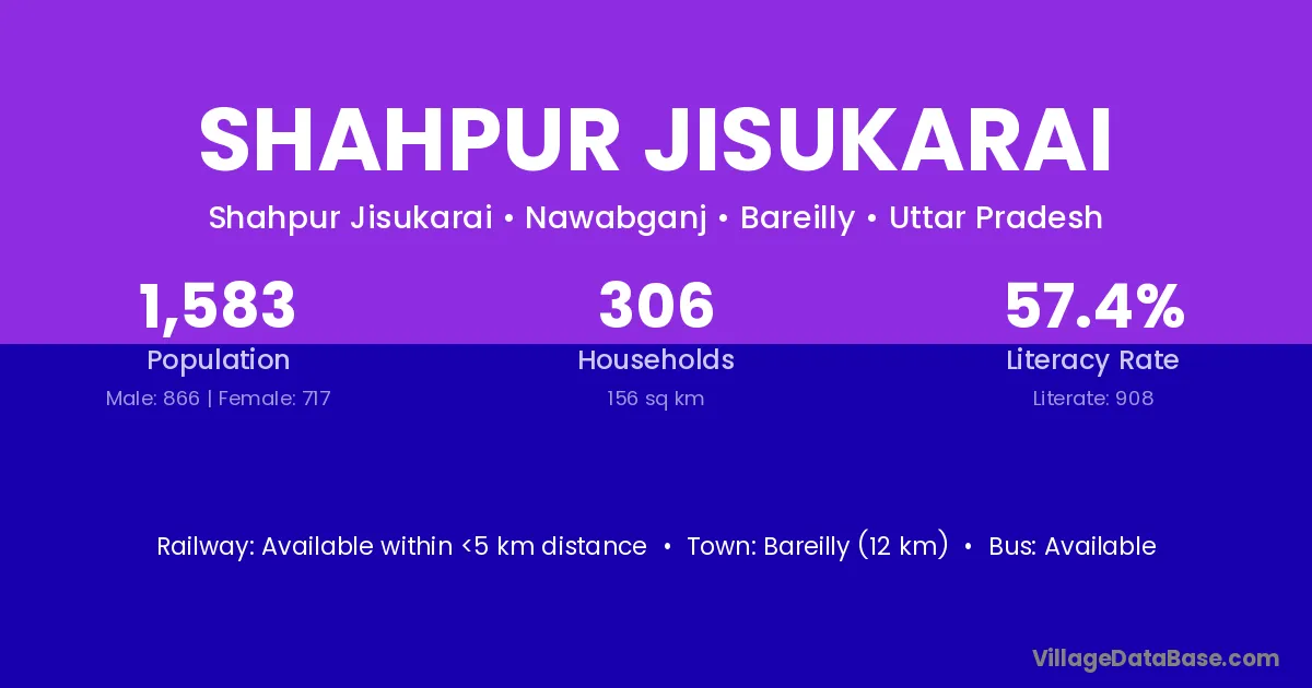 Bareilly (12 km) is the nearest town to Shahpur Jisukarai village for major economic activities and is located approximately 12 km away.