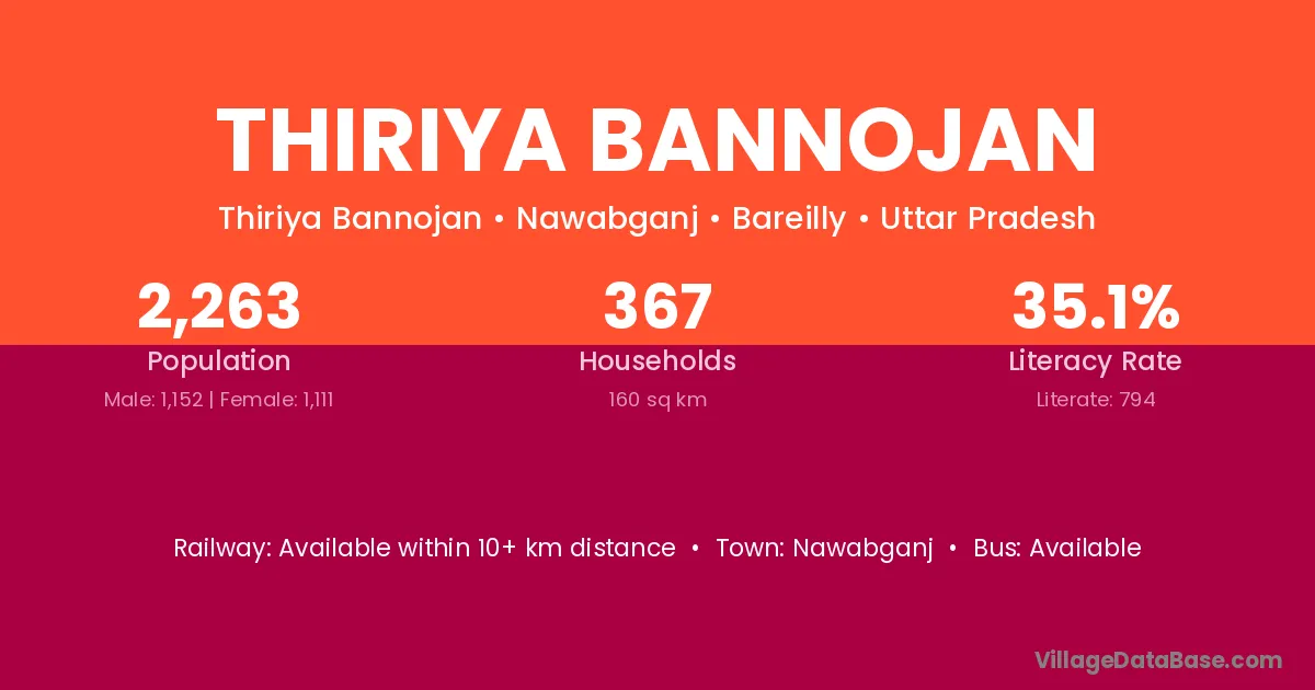 Thiriya Bannojan village has a total population of 2,263 people, of which 1,152 are males and 1,111 are females.