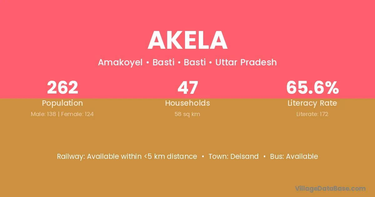 Akela village has a total population of 262 people, of which 138 are males and 124 are females.