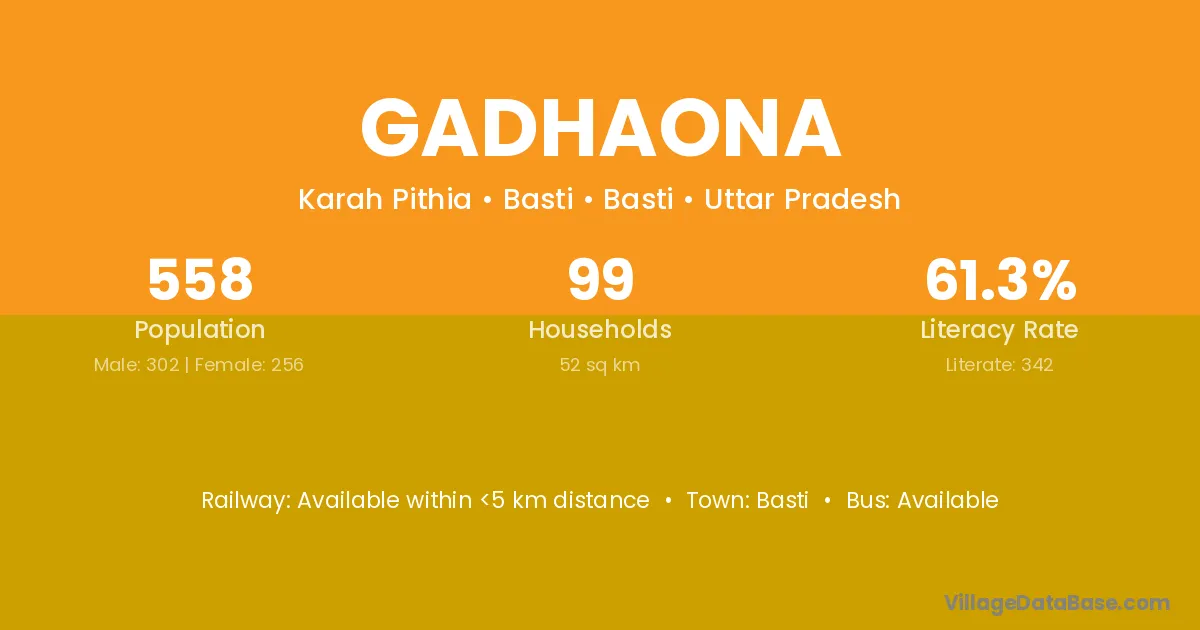 Gadhaona village has a total population of 558 people, of which 302 are males and 256 are females.