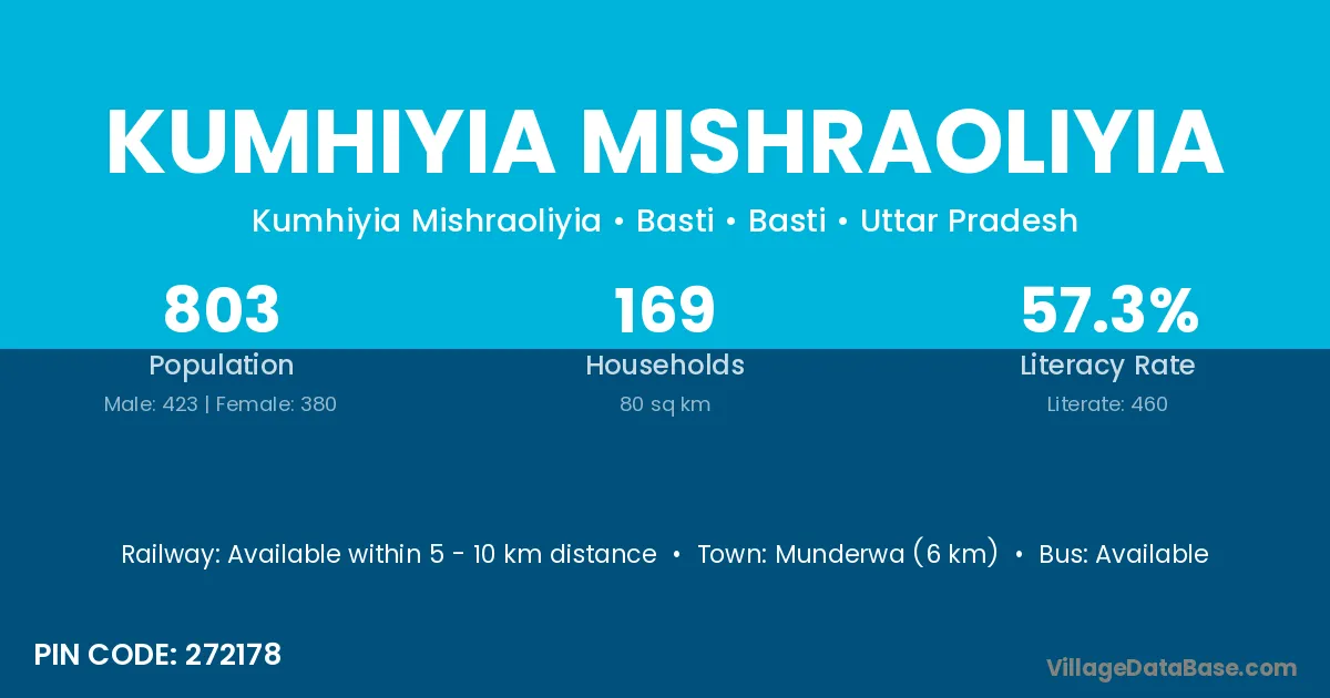 Kumhiyia Mishraoliyia village has a total population of 803 people, of which 423 are males and 380 are females.