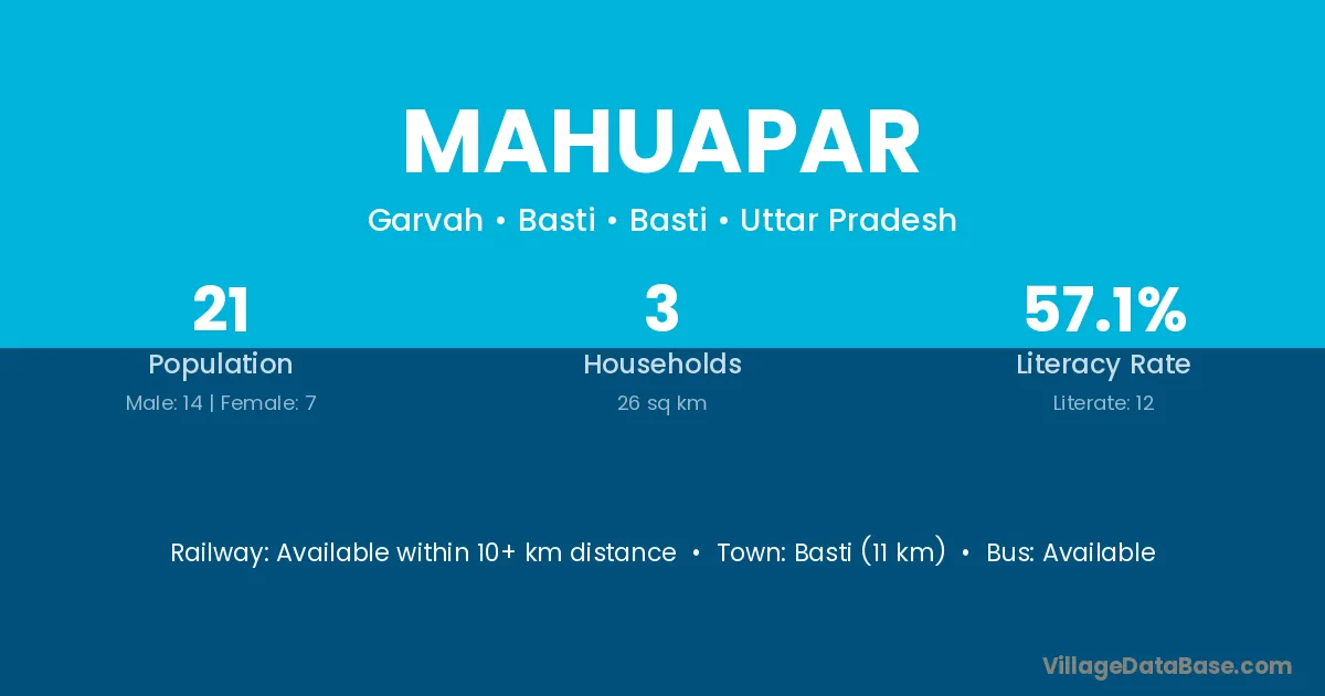 Basti (11 km) is the nearest town to Mahuapar village for major economic activities and is located approximately 11 km away.