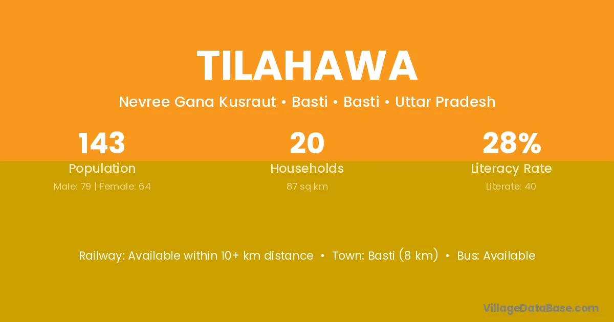 Basti (8 km) is the nearest town to Tilahawa village for major economic activities and is located approximately 8 km away.