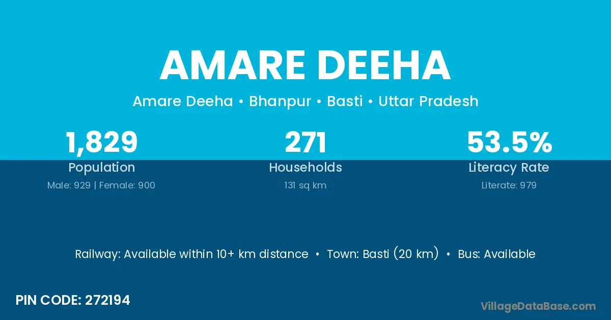 Basti (20 km) is the nearest town to Amare Deeha village for major economic activities and is located approximately 20 km away.