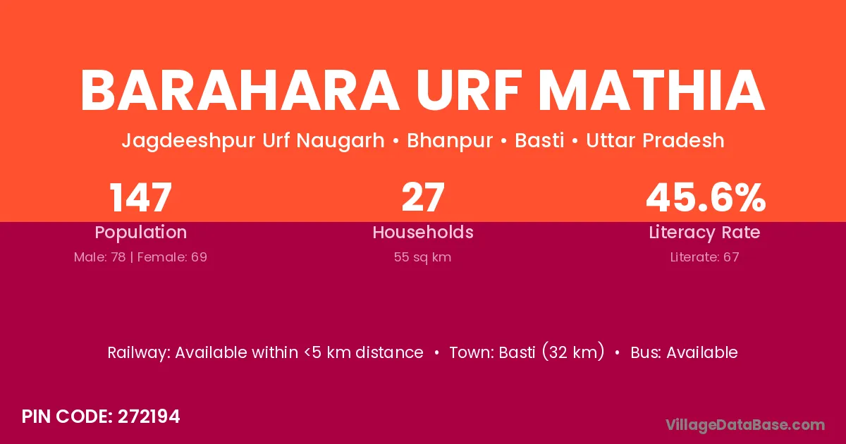 Basti (32 km) is the nearest town to Barahara Urf Mathia village for major economic activities and is located approximately 32 km away.