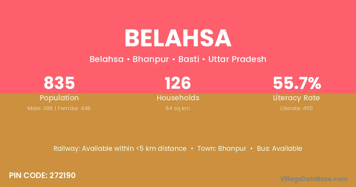 Belahsa village has a total population of 835 people, of which 386 are males and 449 are females.