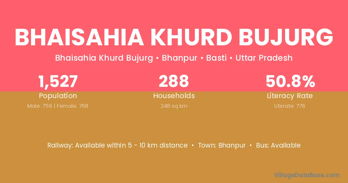 Bhaisahia Khurd Bujurg village has a total population of 1,527 people, of which 759 are males and 768 are females.