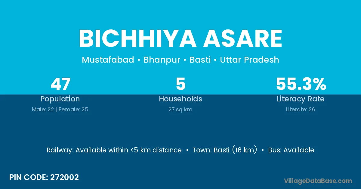 Basti (16 km) is the nearest town to Bichhiya Asare village for major economic activities and is located approximately 16 km away.