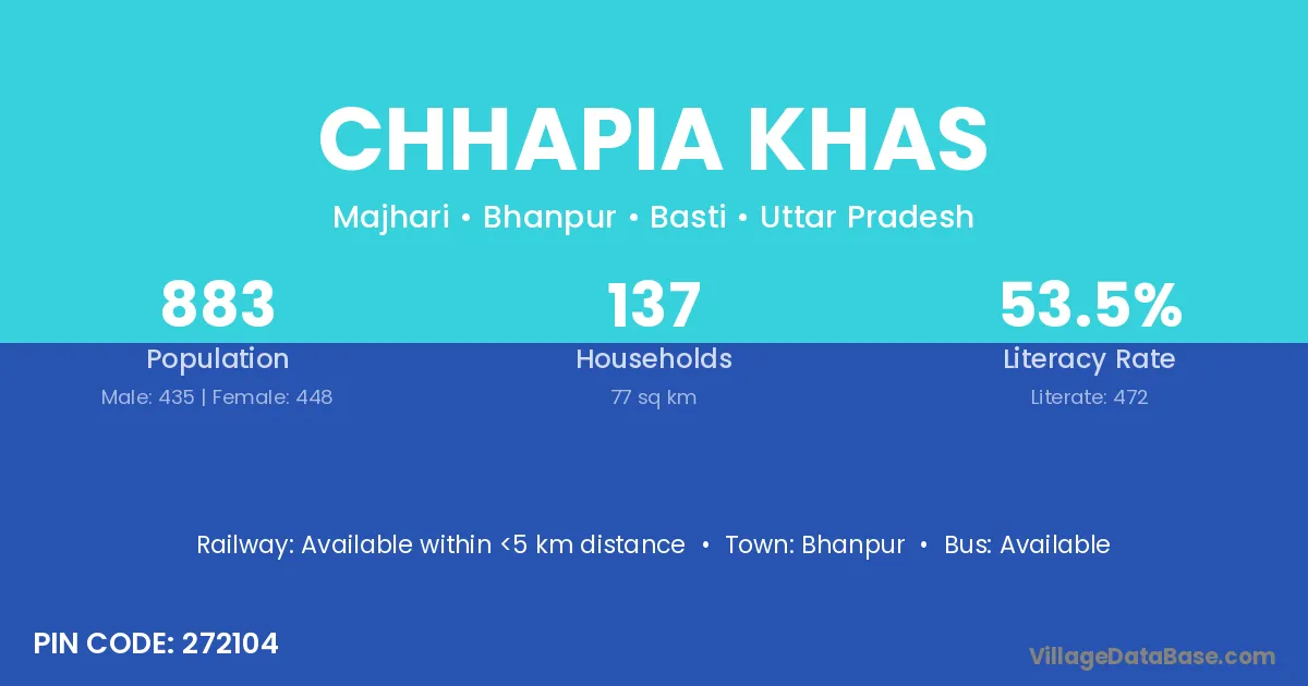 Chhapia Khas village has a total population of 883 people, of which 435 are males and 448 are females.