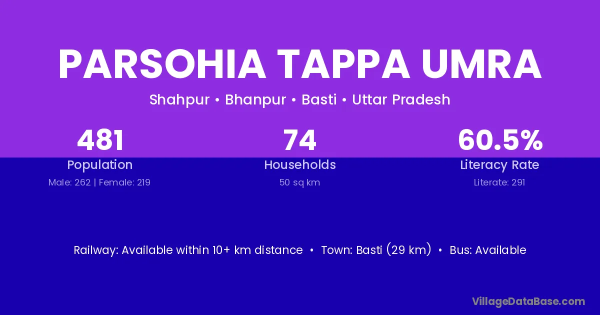 Parsohia Tappa Umra village has a total population of 481 people, of which 262 are males and 219 are females.