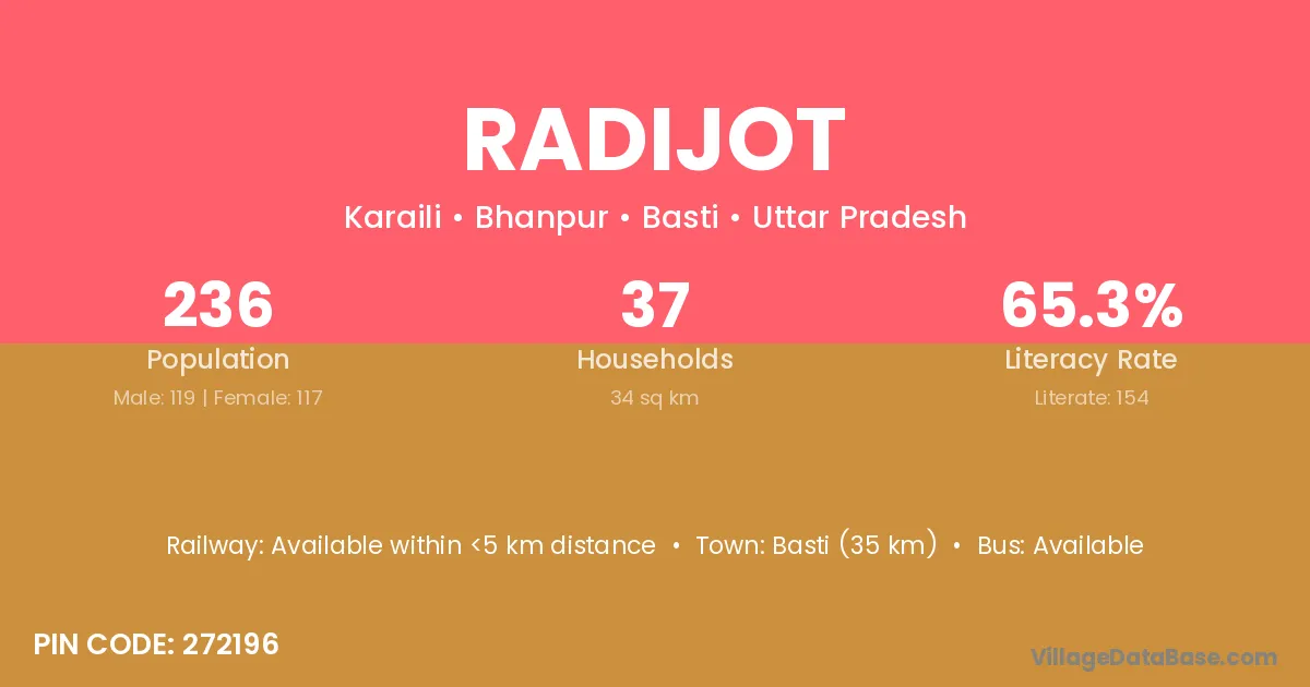 Basti (35 km) is the nearest town to Radijot village for major economic activities and is located approximately 35 km away.