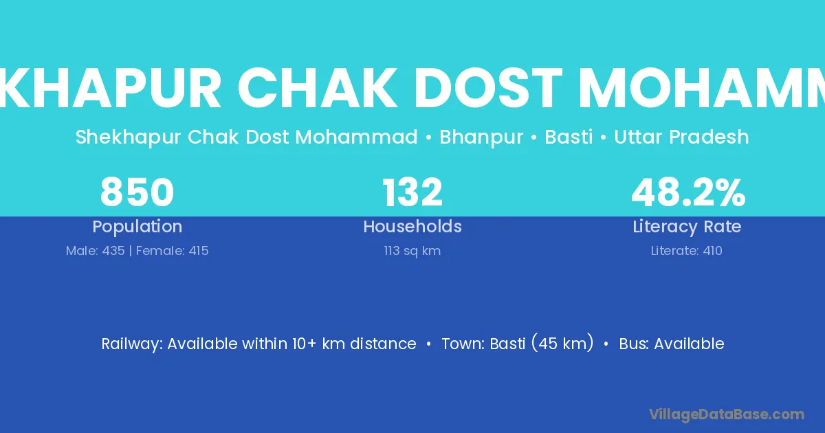 Basti (45 km) is the nearest town to Shekhapur Chak Dost Mohammad village for major economic activities and is located approximately 45 km away.