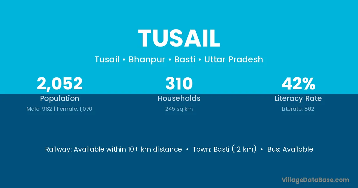 Basti (12 km) is the nearest town to Tusail village for major economic activities and is located approximately 12 km away.