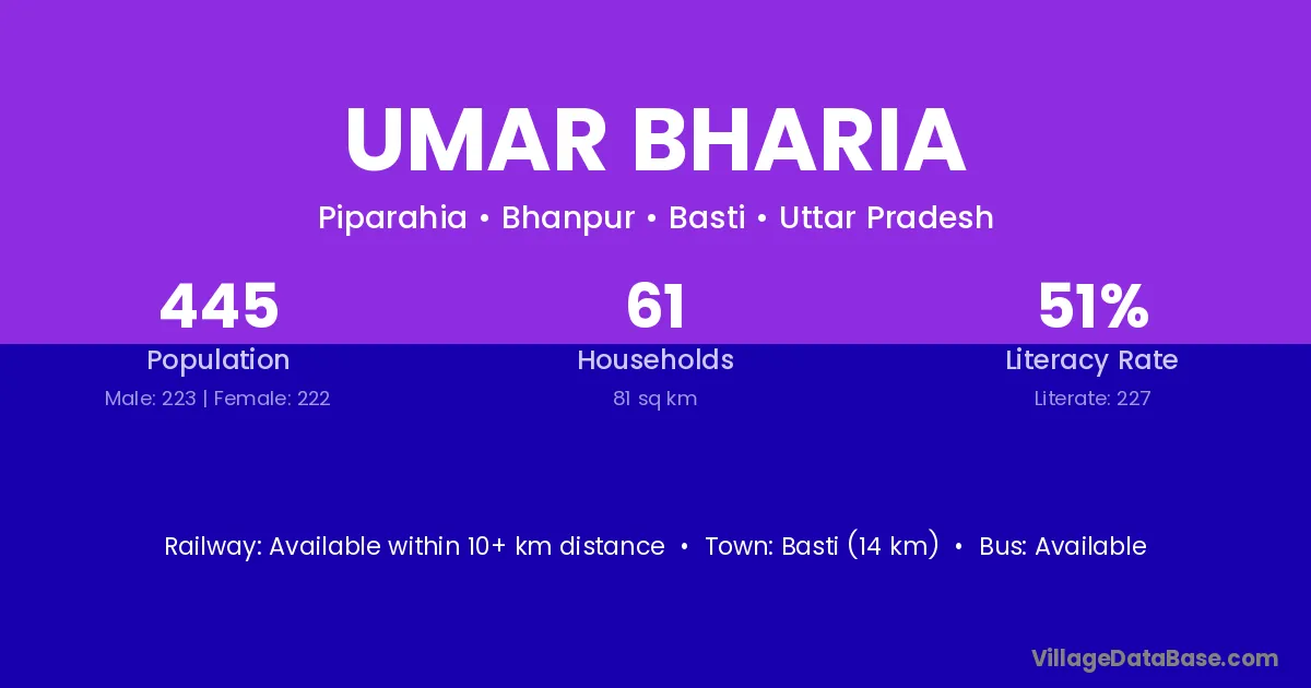 Basti (14 km) is the nearest town to Umar Bharia village for major economic activities and is located approximately 14 km away.