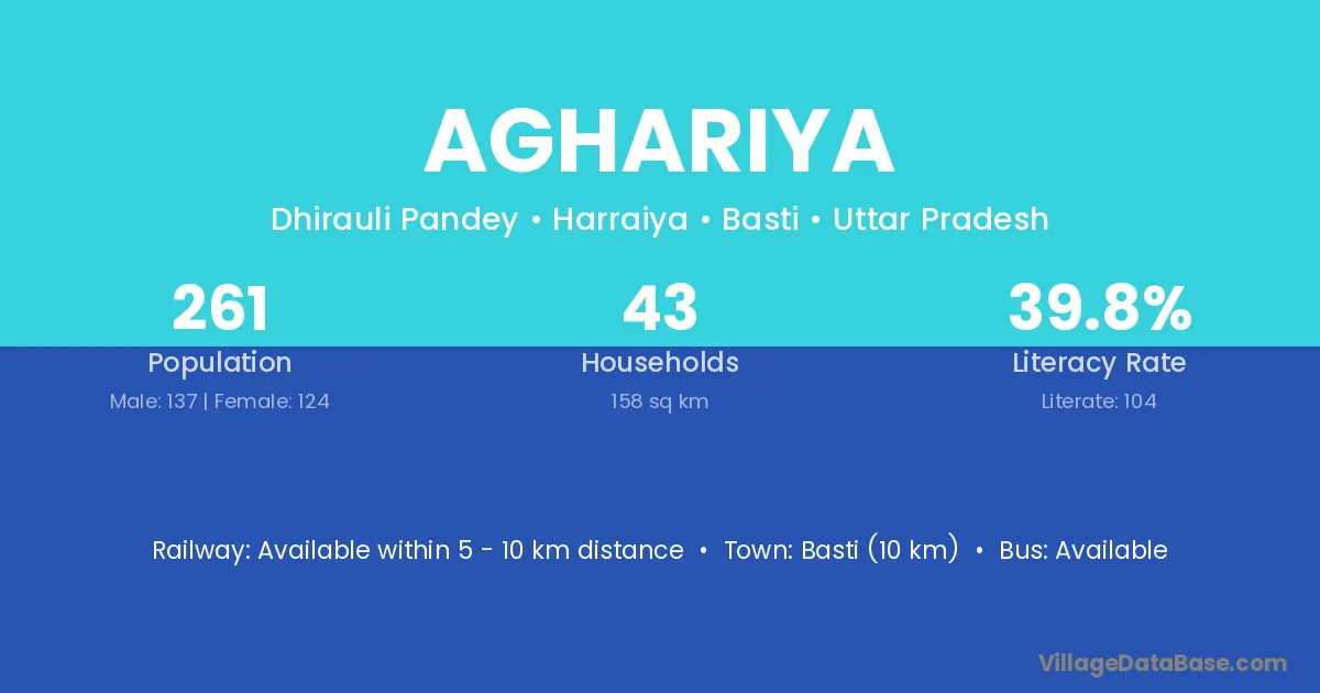 Basti (10 km) is the nearest town to Aghariya village for major economic activities and is located approximately 10 km away.