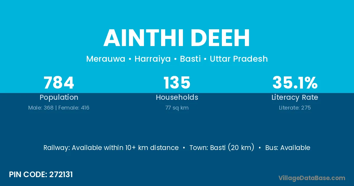 Basti (20 km) is the nearest town to Ainthi Deeh village for major economic activities and is located approximately 20 km away.