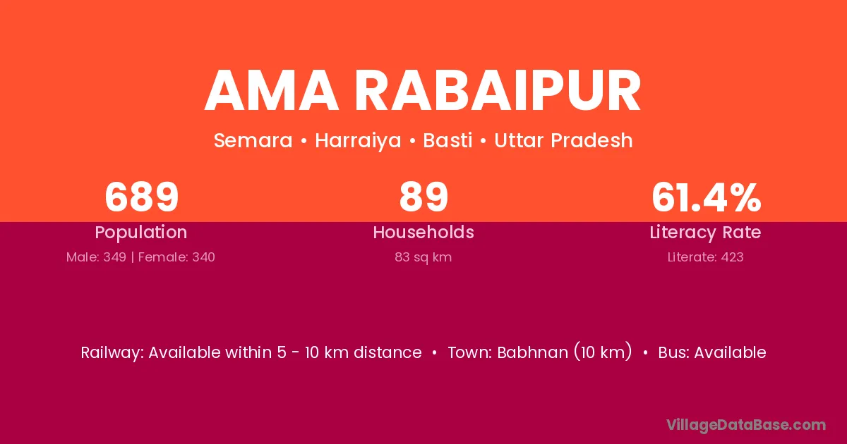 Ama Rabaipur village has a total population of 689 people, of which 349 are males and 340 are females.